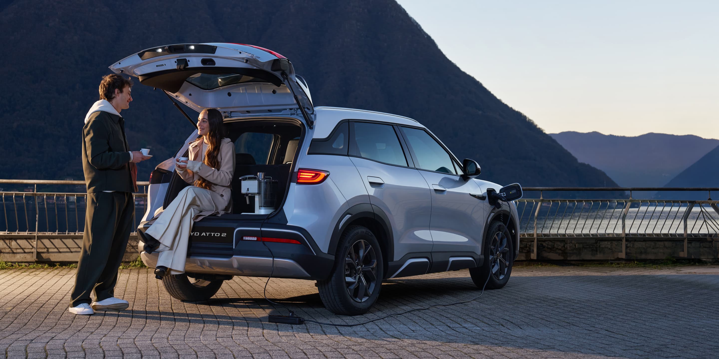 Le BYD ATTO 2 devient bien plus qu’un simple véhicule grâce à sa fonctionnalité V2L (Vehicle-to-Load), transformant votre voiture en une véritable source d'énergie mobile. Branchez et alimentez des appareils tels que des consoles de jeux vidéo, faites fonctionner des appareils pour déguster une tasse de café ou chargez des gadgets lors d'escapades en plein air - parfait pour les pique-niques, les séjours en camping et bien plus encore. La seule limite est votre imagination.